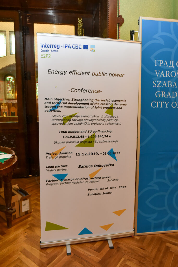 Završna konferencija projekta “Energy Efficient Public Power” (“Energy Efficient Public Power” – E2P2), koji se provodi kroz Interreg IPA prekograničnu suradnju Hrvatska-Srbija u Satnici Đakovačkoj i Subotici, od 2019. godine, održana je 3.lipnja 2022.godine u Velikoj vijećnici subotičke gradske kuće. Završnoj konferenciji ovog projekta utemeljenog na uspostavljanju energetski učinkovitih javnih zgrada kroz primjenu elektrana na obnovljive izvore energije, kao primjer energetski održive i ekološki prihvatljive javne politike, nazočili su gradonačelnik Subotice Stevan Bakić, pomoćnik ministra rudarstva i energetike, Sektor za energetsku učinkovitost i grijanje, Milan Macura i načelnik Općine Satnica Đakovačka Željko Šimić. Prezentaciju realiziranih projektnih aktivnosti za grad Suboticu izložila je Božidarka Golubović, dok je za Općinu Satnica Đakovačka izlagala Božana Rogalo.